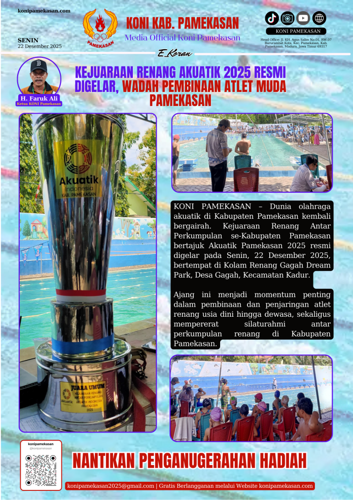 Dunia olahraga akuatik di Kabupaten Pamekasan kembali bergairah. Kejuaraan Renang Antar Perkumpulan se-Kabupaten Pamekasan bertajuk Akuatik Pamekasan 2025 resmi digelar pada Senin, 22 Desember 2025, bertempat di Kolam Renang Gagah Dream Park, Desa Gagah, Kecamatan Kadur.