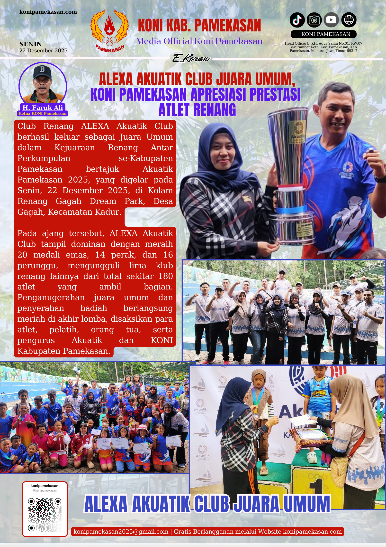 KONI PAMEKASAN – Club Renang ALEXA Akuatik Club berhasil keluar sebagai Juara Umum dalam Kejuaraan Renang Antar Perkumpulan se-Kabupaten Pamekasan bertajuk Akuatik Pamekasan 2025, yang digelar pada Senin, 22 Desember 2025, di Kolam Renang Gagah Dream Park, Desa Gagah, Kecamatan Kadur.
