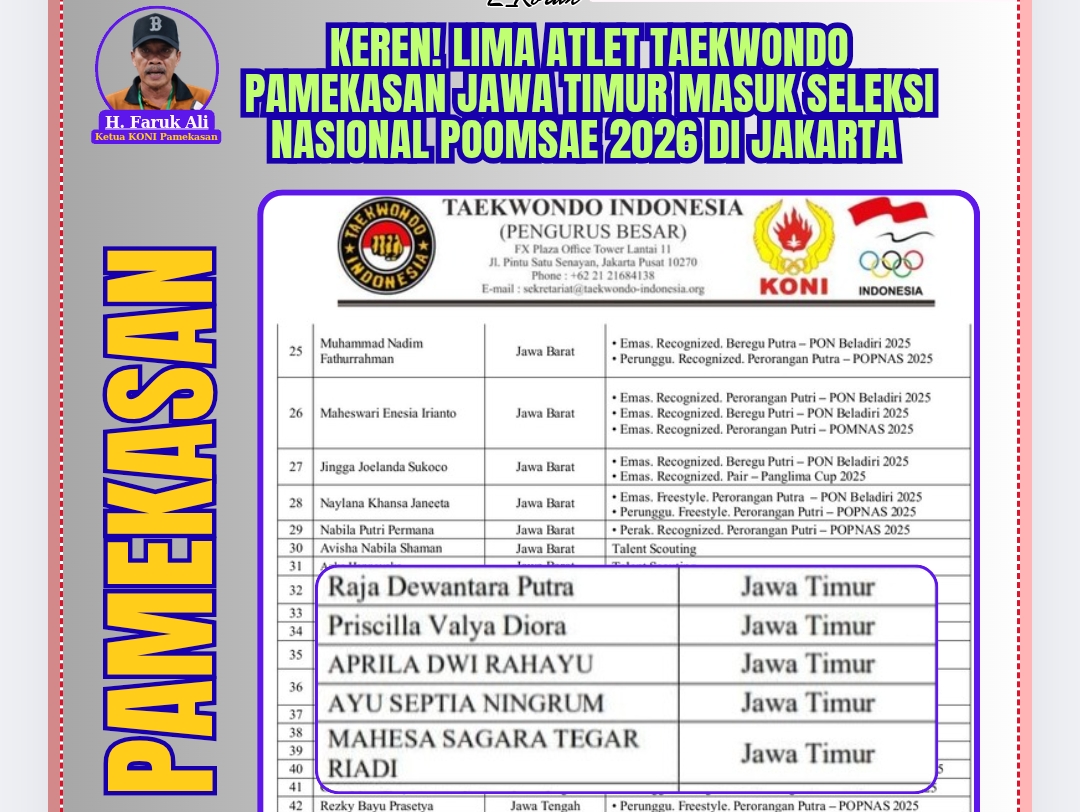 KONI PAMEKASAN — Kabar membanggakan kembali datang dari dunia olahraga Kabupaten Pamekasan. Sebanyak lima atlet Taekwondo Jawa Timur asal Pamekasan resmi terpanggil untuk mengikuti Seleksi Nasional (Seleknas) Poomsae Tahun 2026 yang akan digelar di Jakarta.